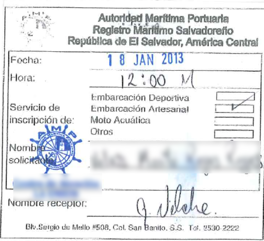 document type Comprobante de trámite de registro de embarcación