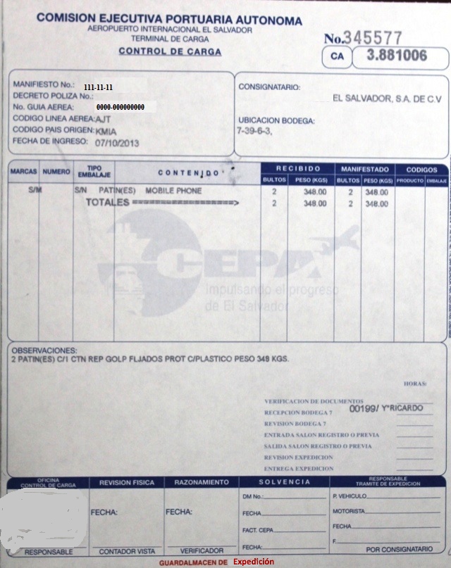 document type Control de carga (Guardalmacén de expedición)a
