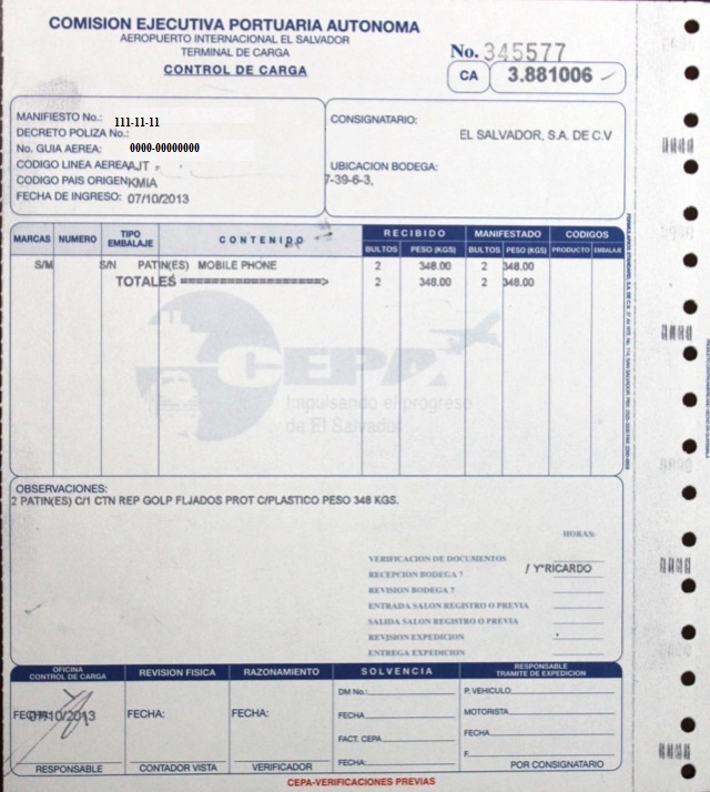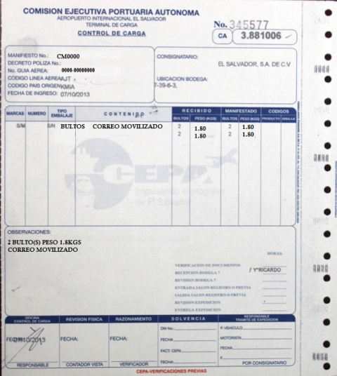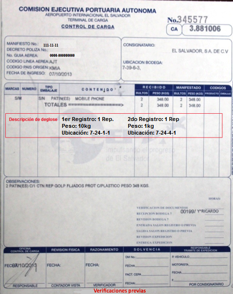 document type Control de carga (Verificaciones previas CEPA)