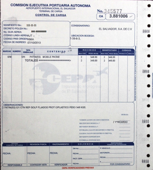 document type Control de carga (Verificaciones previas CEPA)