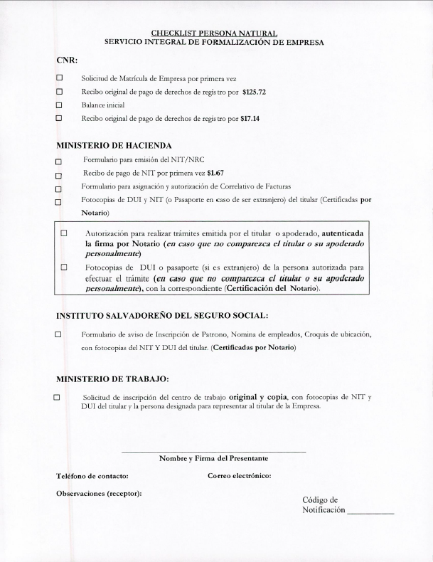 document type Checklist para Persona Natural de los documentos presentados para la inscripción