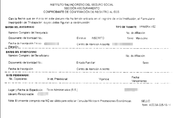 document type Comprobante de confirmación de registro al ISSS