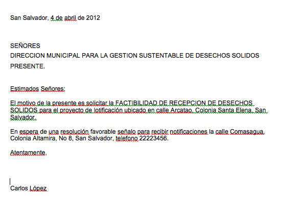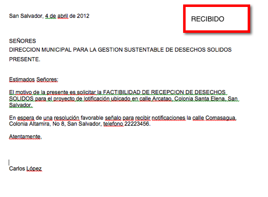 document type Escrito solicitando factibilidad de recepción de desechos sólidos