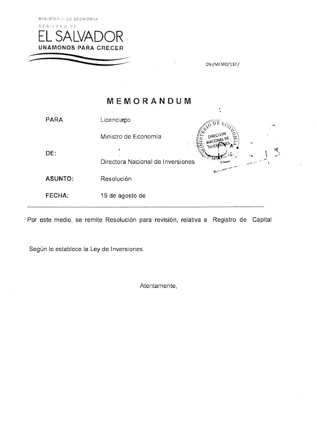 document type Memorándum- solicitud de firma del Ministro registro de capital