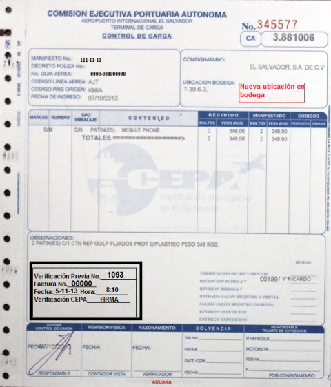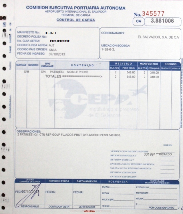 document type Control de carga (Aduana)