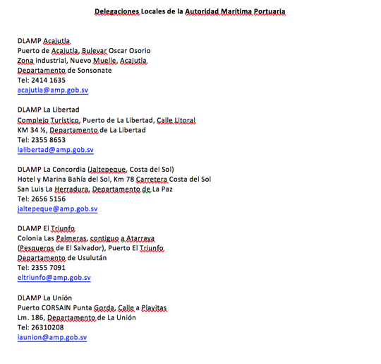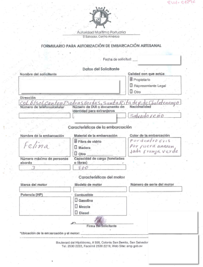 El formulario puede ser presentado en cualquiera de las delegaciones locales de la AMP: Acajutla, La Libertad, La Concordia, El Triunfo, La Unión. El comprobante que se recibe al presentar el formulario es el documento con el que se puede hacer uso de la embarcación para navegar ya que constituye un permiso provisional. En ocasiones al momento de llenar el formulario se establece fecha para la inspección.